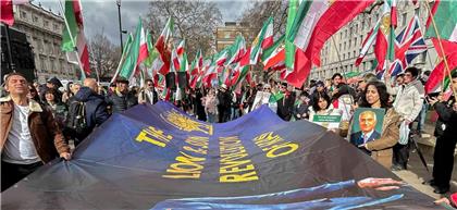 Convocados por la organización "Stage of Freedom" frente a Downing Street, la residencia del primer ministro británico, los asistentes portaban las banderas iraníes anteriores al régimen islámico (con un león en el centro) y retratos de Reza Pahlavi, y gritaron numerosas consignas para reclamar un nuevo estado encabezado por este último, quien ha vivido en el exilio en EE. UU.