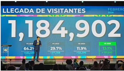 Dijo que la llegada de 1,184,902 en febrero representa un crecimiento de un 13.1% con relación al mismo mes del 2025, un 11.9% respecto al 2024 y un 64.2% frente al 2019.